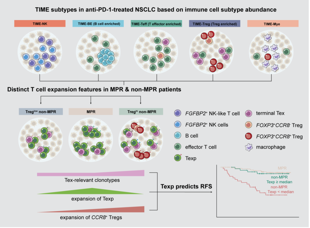 该研究依据每例患者肿瘤中不同免疫细胞亚型的相对丰度对患者进行聚类,识别了新辅助免疫治疗后的5类免疫微环境亚型(TIME-subtypes),包含富集FGFBP2+ NK细胞的高响应性亚型(TIME-NK)、富集B细胞与三级淋巴结构的高响应性亚型(TIME-BE)、富集效应T细胞的高响应性亚型(TIME-Teff)、富集Treg与终末耗竭T细胞的低响应性亚型(TIME-Treg)及富集髓系细胞的低响应性亚型(TIME-Mye)。值得注意的是,non-MPR患者中有近半数表现为TIME-Treg亚型,提示了Treg富集与低缓解率的相关性。