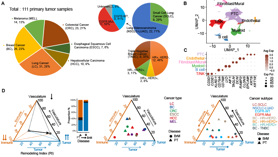图1:研究整体流程、BrM组成细胞类型及比例差异分析