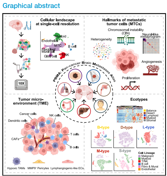 2025年4月10日,北京大学生物医学前沿创新中心(BIOPIC)白凡教授团队、中山大学附属第一医院张弩教授团队、中山大学肿瘤防治中心牟永告教授团队与美国哥伦比亚大学Benjamin Izar教授团队合作在Cancer Cell杂志在线发表了题为"Pan-cancer human brain metastases atlas at single-cell resolution"的研究论文。该研究构建了迄今为止最大规模泛癌脑转移高质量单细胞精度图谱——PBMA(Pan-cancer Brain Metastases Atlas)。鉴定了BrM跨癌种保守的特征(Hallmarks),提供了潜在可临床干预的靶标。特别地,本研究首次在脑转移领域鉴定出五种生态型(BrM-Ecotype),分别对应特定病理模式和临床特征。这些发现为攻克脑转移这一难题提供了新思路、新策略。