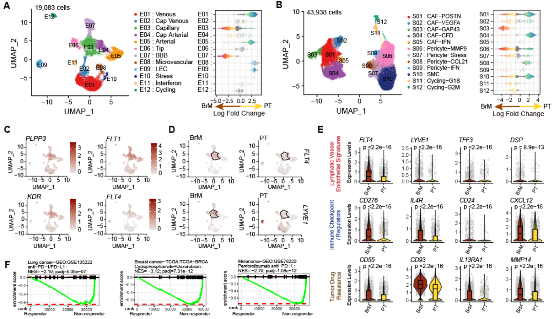 通过细胞丰度差异分析,作者发现BrM-TME富集免疫抑制性细胞类型或状态,包括:缺氧型肿瘤相关巨噬细胞(Hypoxic TAMs)、MMP9+周细胞(MMP9+ Pericytes)以及一群特殊的淋巴管样血管内皮细胞(Lymphangiogenic-like ECs)。进一步作者发现这些细胞状态与BrM的不良预后及免疫治疗耐药相关(图4)。
