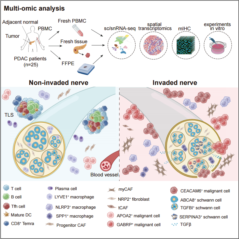 被称为“癌王”的胰腺导管腺癌(Pancreatic Ductal Adenocarcinoma, PDAC)高发神经侵犯(Neural Invasion, NI),严重影响病人预后及生存质量。外科医生在临床实践中发现,局部神经清扫手术能减少病人术后复发,但其原因及机制尚未清晰。为了描绘胰腺癌的“神经暗网”地图,深圳湾实验室联合北京大学生物医学前沿创新中心、广东省人民医院、昌平实验室、重庆医科大学的研究团队运用前沿的单细胞/单细胞核测序、空间转录组测序手段,结合mIHC、病理形态学分析及体外实验,系统对比不发生神经侵犯与发生神经侵犯的胰腺癌组织,刻画了人胰腺癌组织中神经束的内外微环境,解析了肿瘤相关神经束的具体细胞组分及其与癌细胞、免疫细胞和基质细胞的相互作用,揭示了癌细胞发生神经束侵袭转移(Neural Invasion, NI)的细胞及分子机制。